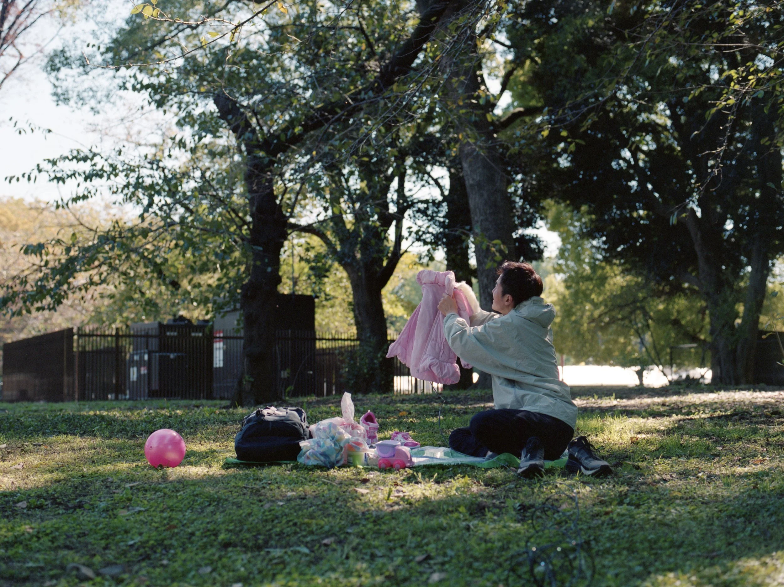 最后想介绍的作品来自冲绳的男性摄影师寺田健人。照片中的他处在一个颇具家庭氛围的场景中,像是在和画面外的家人互动,但画面中除了他之外空无一人。在画面角落摆放的粉色物件成为了某种线索,暗示着女儿与妻子的存在。